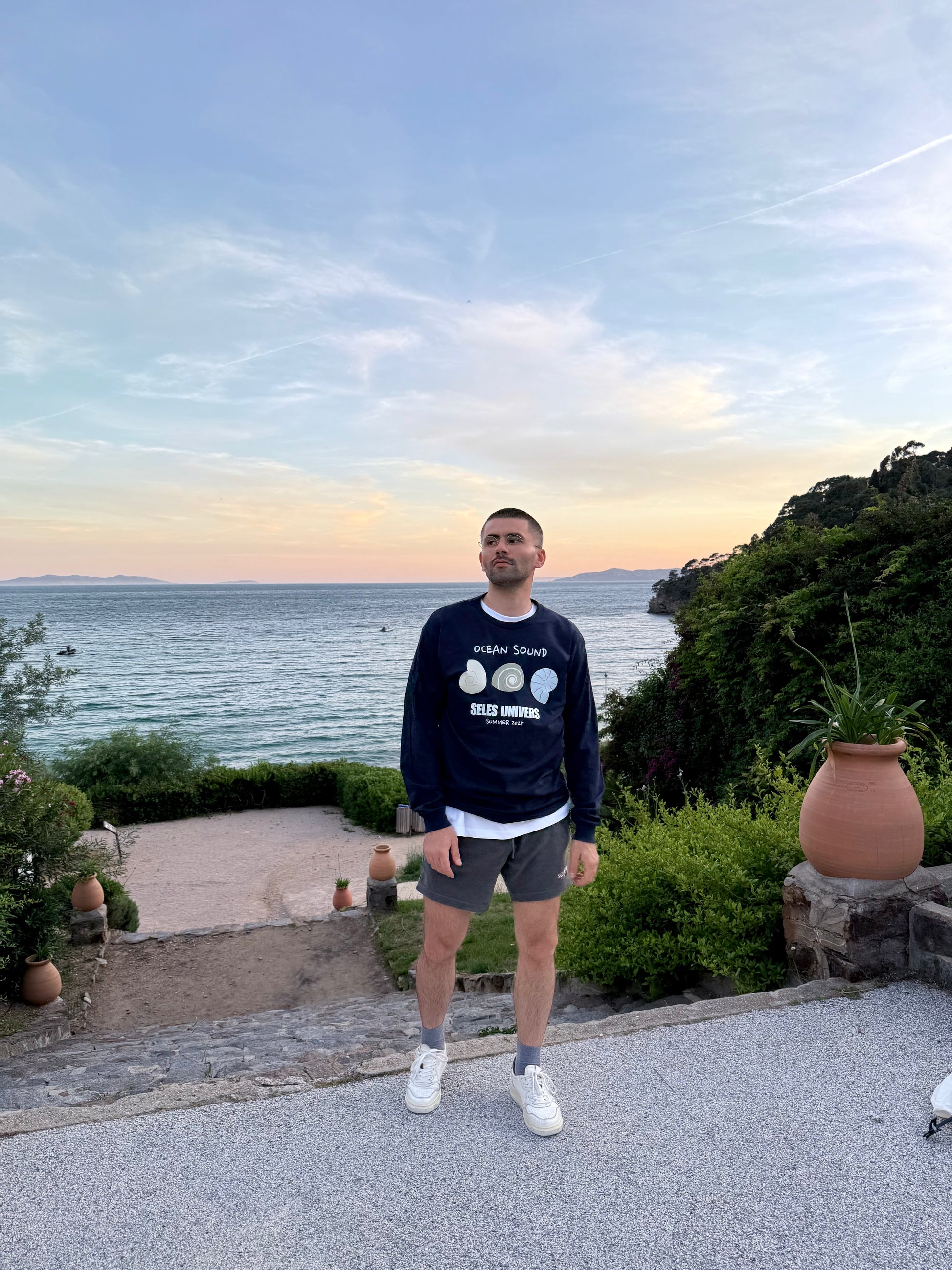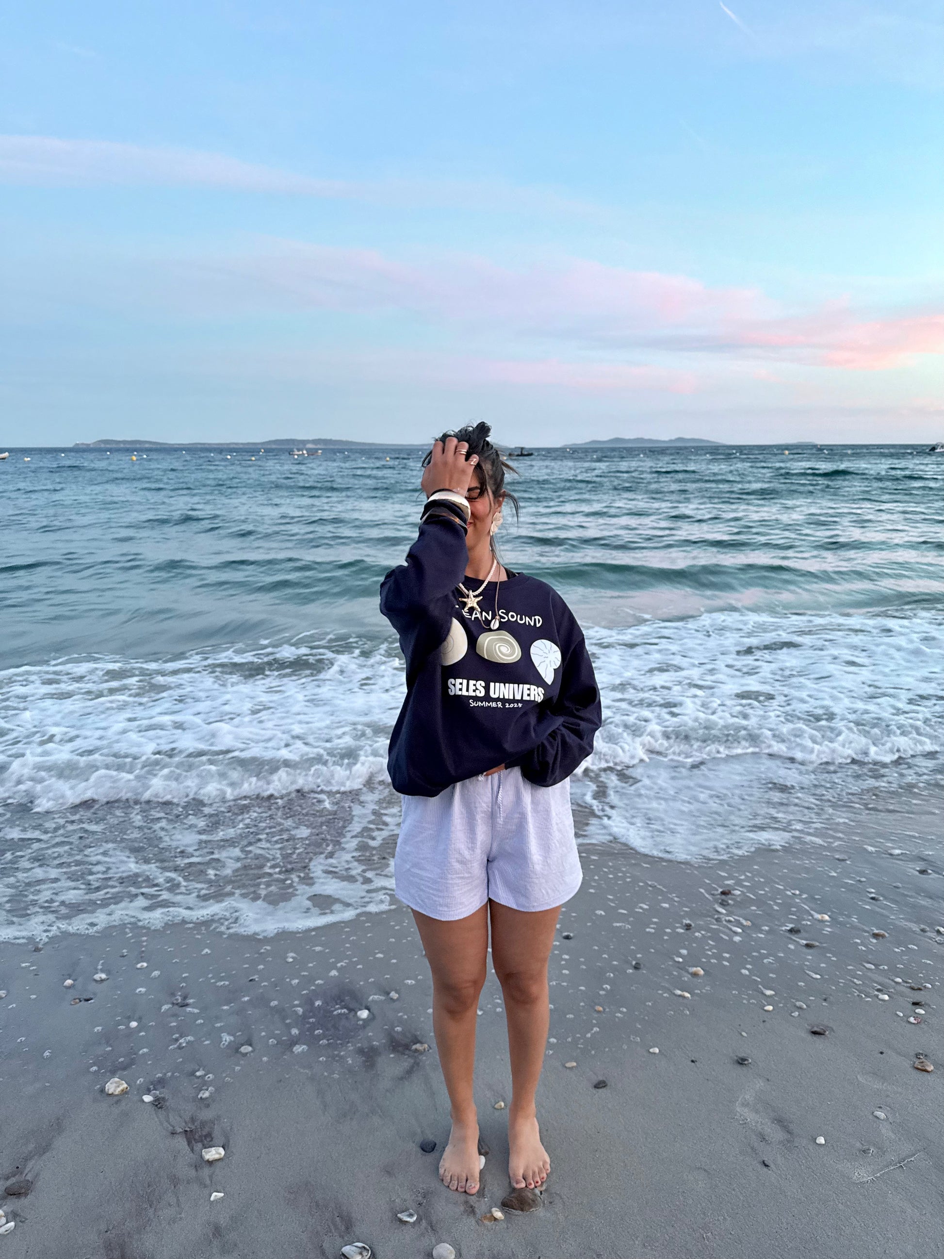 T-shirt bleu nuit manches longues oversize, épaules tombantes. Design français coquillage. Idéal pour la saison, vous serez conquis par sa douceur.